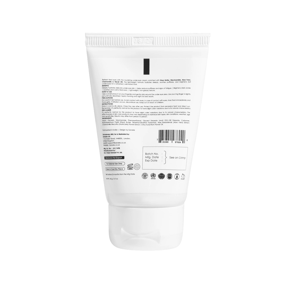 Aqua (Water), Butyrospermum Parkii (Shea) Butter, Glycerin, Niacinamide, Caprylic/Capric Triglyceride, Cetearyl Alcohol, Aloe Barbadensis Leaf Juice, Chamomilla Recutita (Chamomile) Flower Extract, Citrus Aurantium Amara (Neroli) Flower Oil, Sodium Hyaluronate, Tocopheryl Acetate (Vitamin E), Allantoin, Panthenol, Caffeine, Glyceryl Stearate, Dimethicone, Xanthan Gum, Phenoxyethanol, Ethylhexylglycerin, Citric Acid.